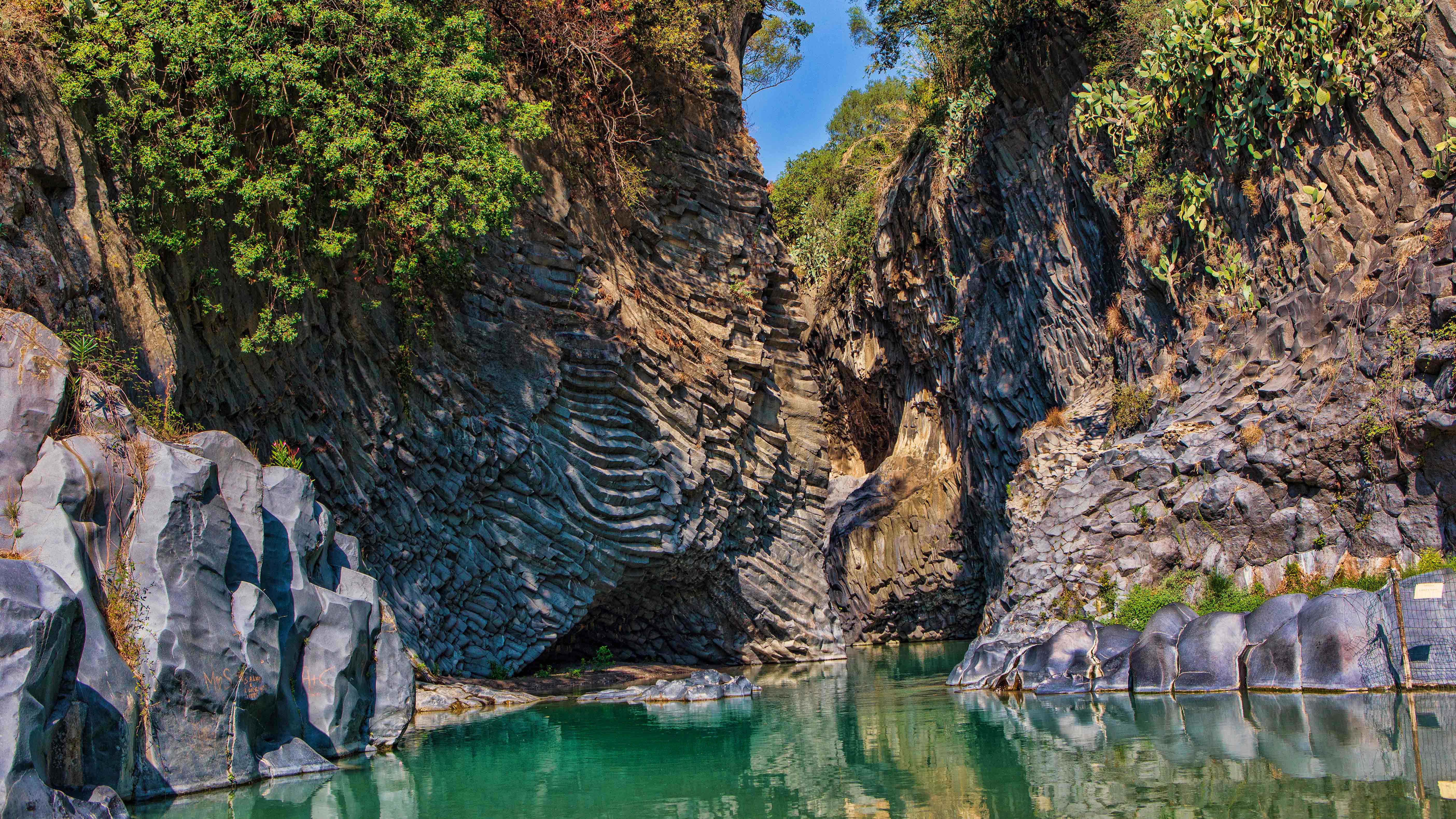 Seguirai il fiume che scorre su un letto di pietra lavica per ammirare le forme prismatiche impresse sulle pareti rocciose della valle.